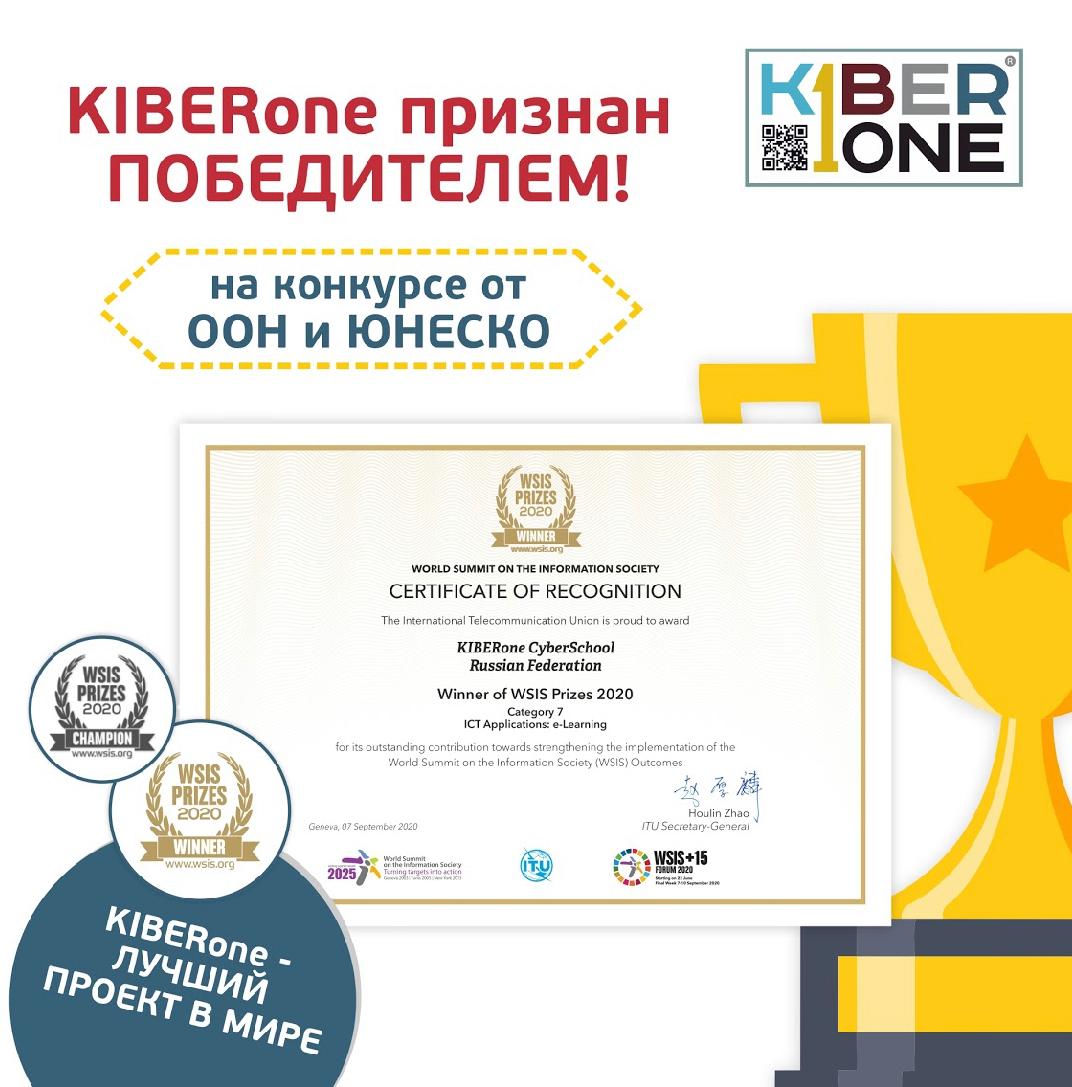 KIBERone стал мировым лидером в сфере цифрового образования детей, по версии Генеральной Ассамблеи ООН и ЮНЕСКО в рамках международного конкурса WSIS Prizes 2020.